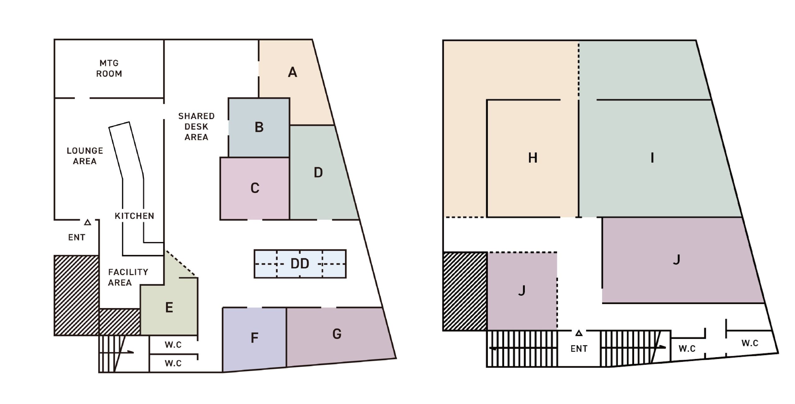 小〜中規模のチームが集中できる個室や固定席、フリーアドレス席などのフレキシブルなプラン、会議室やラウンジなどのコモンエリアをご提供しています。