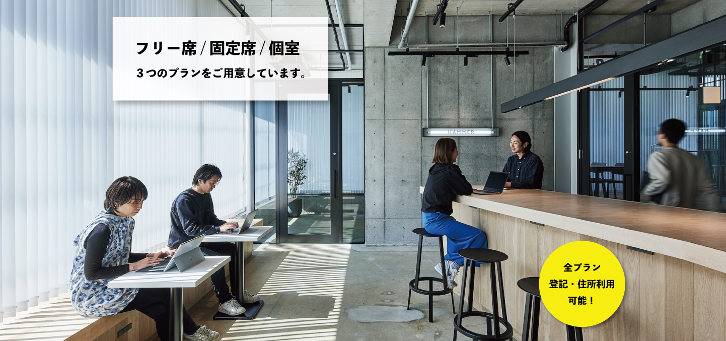 HAMMER by co-baは、事業開発、デザイン、マーケティング、プロダクト開発など多様な領域のプロフェッショナルが集まる「仕事が拡がる」コンセプトとしたセットアップオフィス&コワーキングスペースです。