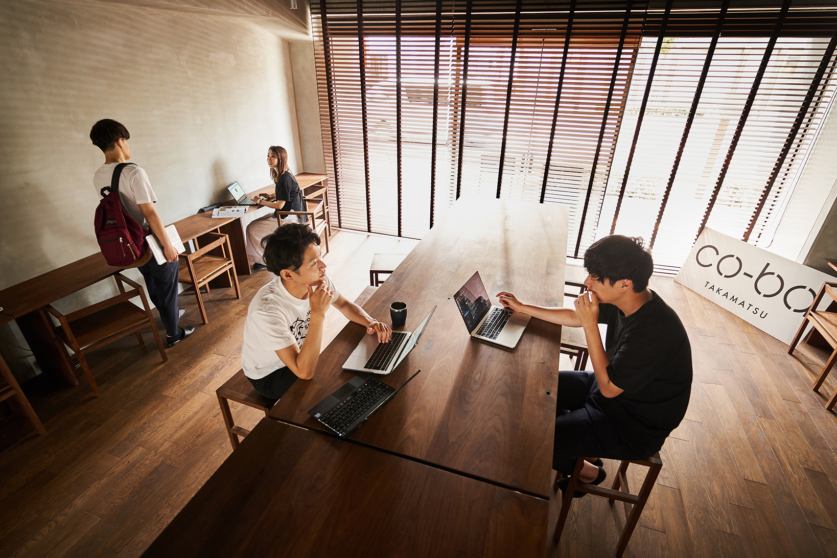 co-ba takamatsuは起業家、フリーランス、学生など、地域で活動するさまざまな人が集まるコワーキングスペース。